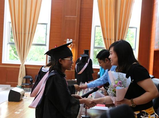 随后,外国语学院徐志英院长为毕业生拨穗,院党委彭荣书记为毕业生颁发学位证书。舞台中间,扶正流苏,授予学位,或是拥抱,或是欢呼,那一刻,为各自的外院生活划上一个完美的句号。