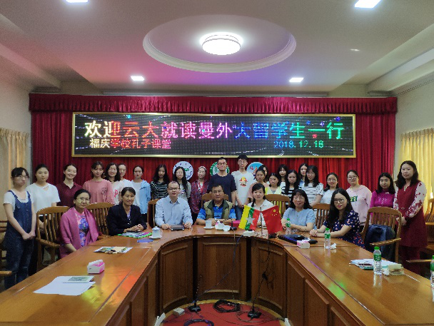 第二天,何淼淼副书记一行率领同学们到访曼德勒福庆学校孔子课堂。福庆学校校长李祖清教授、孔子课堂中方主任李涛副教授对我们的到来表示热烈欢迎。在座谈会上,李涛老师激励在缅留学的同学们要努力学习,尽快适应缅甸生活,学以致用,并鼓励大家到教学点做志愿者,增加自己的社会实践经验。随后,何淼淼副书记也介绍了环球首页(中国)网页版留学生情况,对在缅学习的同学们提出了新的要求和期望,并希望进一步加强环球首页(中国)网页版与与福庆孔子课堂的合作。最后,福庆学校校长李祖清教授表示,今后将为在缅学习的云大留学生们专门开设缅甸文化讲座课程,提供更加优质的志愿服务岗位和学习资源。