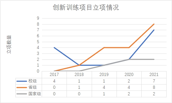 在各类别项目的立项情况上,外国语学院近年来的状况也越来越好。以外国语学院立项较为集中的创新训练项目为例: