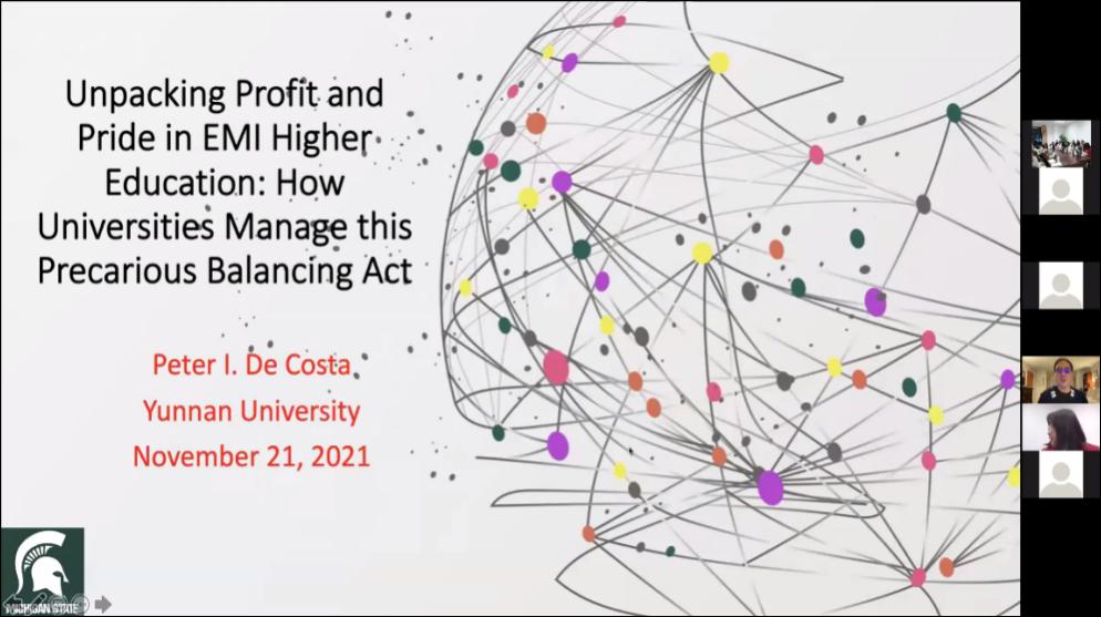 此次讲座以“解析EMI高等教育的利与誉:高校如何权衡利弊(Unpacking Profit and Pride in EMI Higher Education: How Universities Manage this Precarious Balancing Act)”为主题。