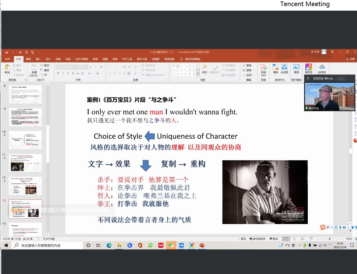 2022年3月24日,著名影视翻译专家、中国传媒大学外国语言文化学院博士生导师,全国高校影视艺术学会影视国际传播专业委员会副主任委员兼副理事长麻争旗教授应邀,为环球首页(中国)网页版师生举办了论影视剧对白英汉翻译的艺术的学术讲座。