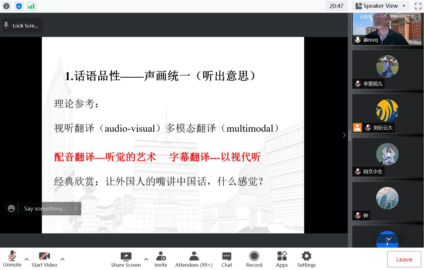 麻争旗教授的讲座使大家进一步了解了译者如何发挥主观能动性进行修辞重构的艺术创作,以及对影视剧对白英汉翻译的艺术产生了新的领悟,令人受益匪浅。