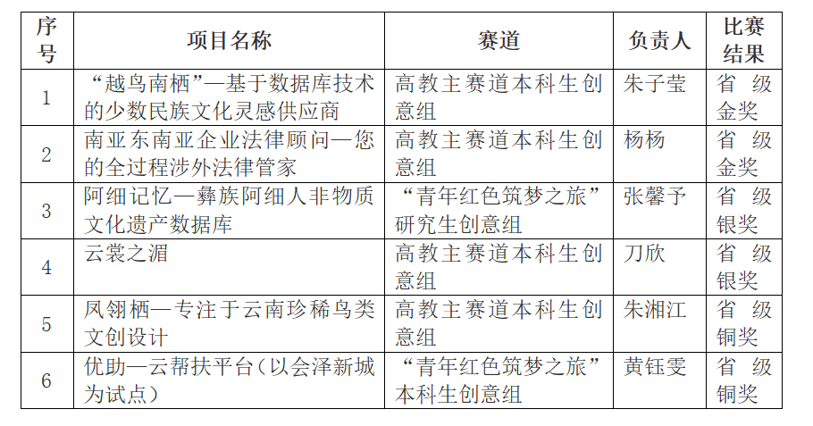 进入7月的省内评审阶段,环球首页(中国)网页版6个晋级省赛的项目均顺利通过省内初审。其中高教主赛道的《“越鸟南栖”—基于数据库技术的少数民族文化灵感供应商》、《南亚东南亚企业法律顾问—您的全过程涉外法律管家》项目和“青年红色筑梦之旅”赛道的《阿细记忆—彝族阿细人非物质文化遗产数据库》项目入围省级金奖争夺赛现场路演决赛。