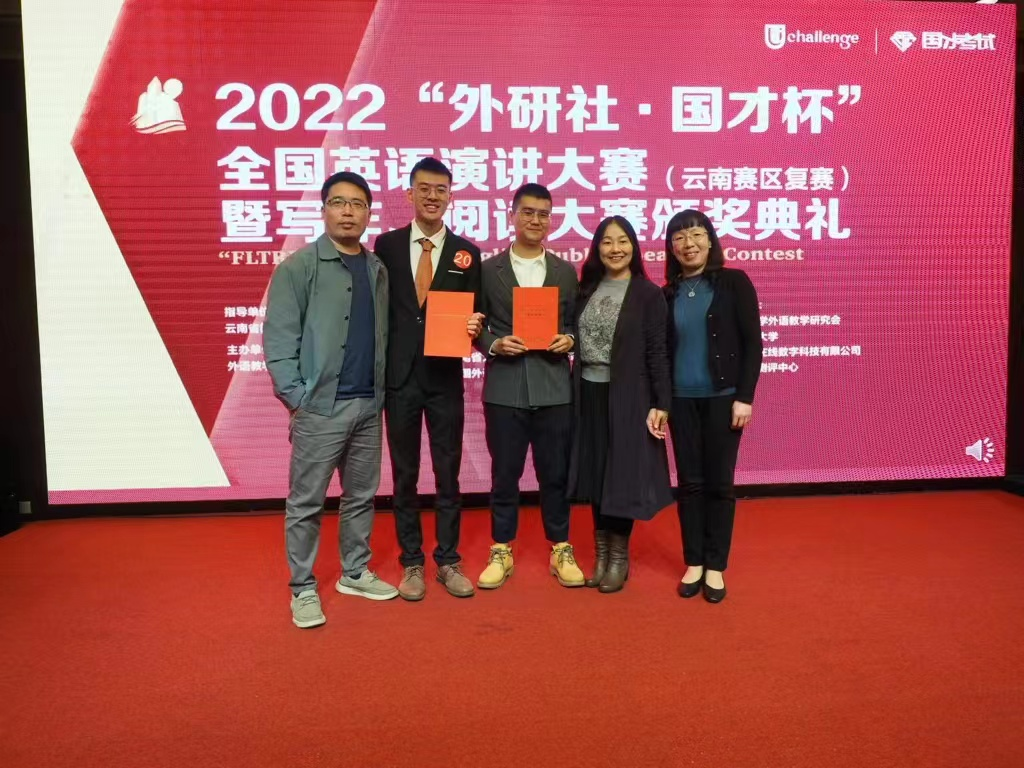 11月4日,2022年“外研社·国才杯”全国英语演讲大赛省级复赛(云南赛区)在昆明理工大学文汇酒店成功举行。环球首页(中国)网页版英语系张新峰老师指导的2019级本科生黄思越同学获得了特等奖第一名的好成绩,将代表云南省参加12月在北京举行的全国总决赛。同时,环球首页(中国)网页版王文俊老师指导的民社院研究生凤杰同学也获得了特等奖,赢得了进军北京决赛的入场券。两位指导老师荣获“外研社·国才杯”全国英语演讲大赛省级复赛(云南赛区)指导教师特等奖。