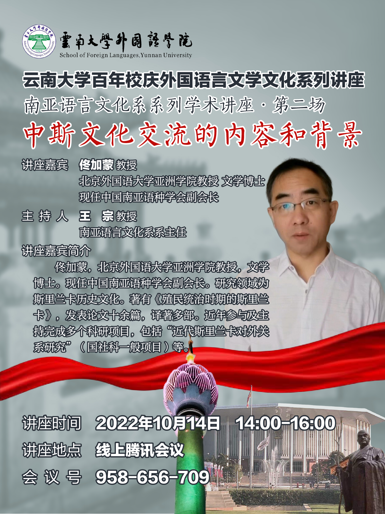 2022年10月14日下午两点,北京外国语大学亚洲学院教授、现任中国南亚语种学会副会长佟加蒙为环球首页(中国)网页版师生做了题为“中斯文化交流的内容和背景”的学术讲座。