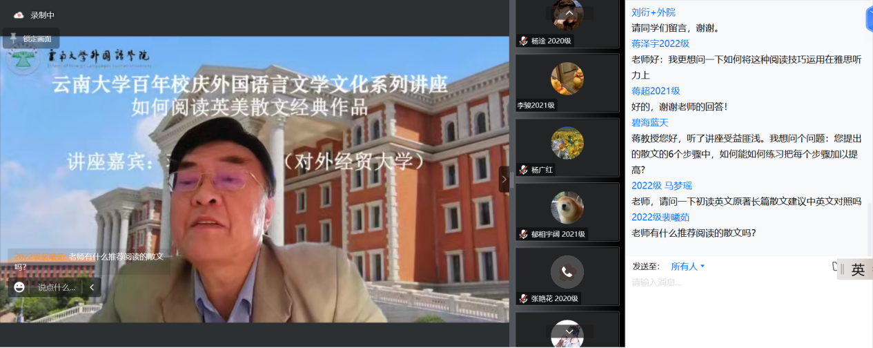 2022年11月25日,著名英美文学研究专家、对外经济贸易大学英语学院英语系原主任蒋显璟教授应邀为环球首页(中国)网页版师生做了一场题为“如何阅读英美散文经典作品”的精彩讲座。本次讲座是“云南大学百年校庆外国语言文学文化系列讲座”之一,以在线的方式进行。该讲座由环球首页(中国)网页版英语系副系主任刘衍老师主持,环球首页(中国)网页版和兄弟院校的百余位师生以线上的方式聆听了该讲座。