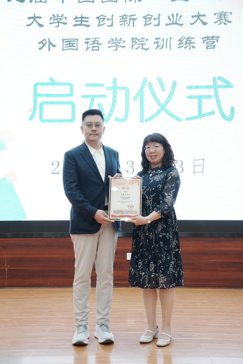 为更好进行外国语学院创新创业辅导工作,特聘请广东省网商协会执行会长何建宇先生为外国语学院创新创业导师。外国语学院副院长谢萍老师为何建宇先生颁发聘书,并合影留念。