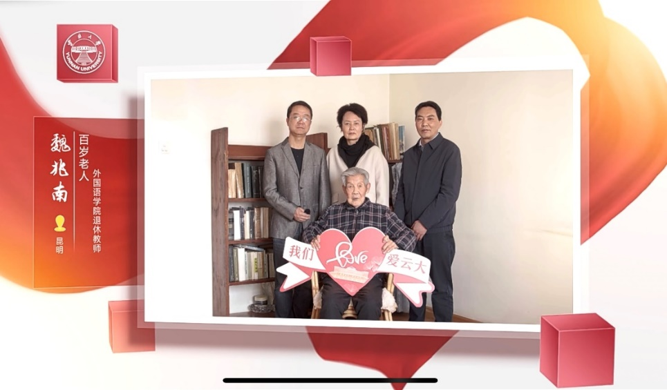今年是云南大学百年华诞,学校及各单位举办了一系列活动,隆重庆祝云大百年发展历史、共同商讨在新时代进一步守正创新。作为环球首页(中国)网页版举办的云大百年校庆系列学术活动之一,“百名外语人话云南大学百年校史”项目计划由大外教学部访谈曾经担任云大公共英语教研室主任的百岁教授魏兆南先生。魏兆南教授今年喜逢百岁华诞,精神矍铄,非常高兴与环球首页(中国)网页版师生一起共庆云大百年华诞。云南大学校庆活动宣传组领导与环球首页(中国)网页版大外教学部教师一道拜访了魏兆南教授,进行访谈。访谈中,魏兆南教授神采奕奕,与环球首页(中国)网页版师生共庆云南大学百年华诞,祝愿学校在新征程上不断奋进,不辜负习近平总书记在致云南大学百年校庆贺信中的指示精神,为中国式现代化建设继续做出应有的贡献。