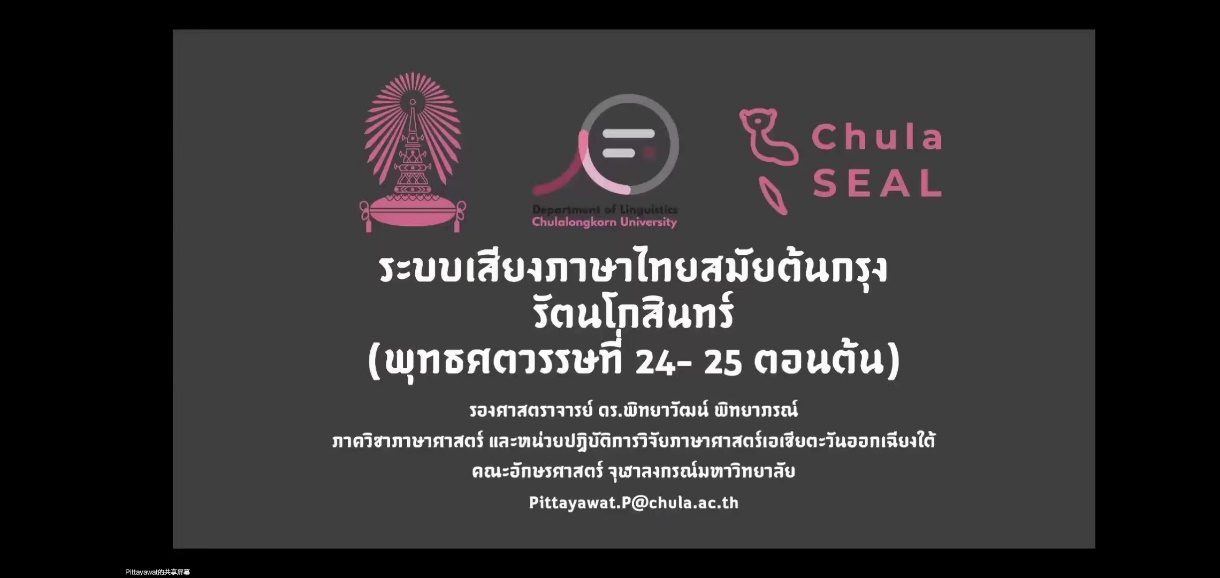 Pittayawat副教授的讲座分析了泰国曼谷王朝初期(拉玛一世——拉玛四世时期)的泰语语音系统,认为曼谷王朝初期的泰语辅音系统与阿瑜陀耶王朝末期及现代泰语辅音系统相同,而元音系统仅与素可泰王朝时期相似,但与现代泰语的元音系统有所差异。声调方面则与阿瑜陀耶王朝末期的泰语声调更为接近。