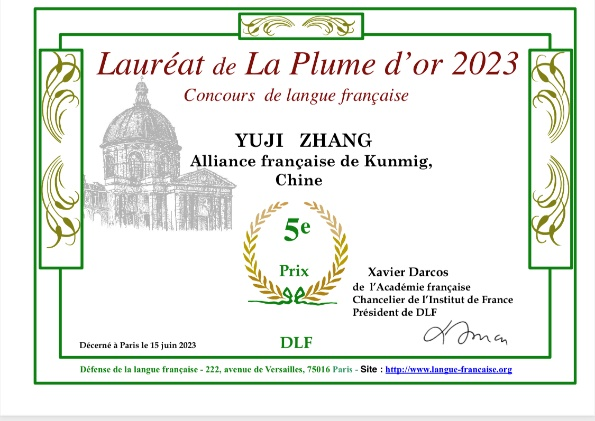 在 “2023金羽毛”全球法语大赛中,环球首页(中国)网页版法语系2022届本科毕业生张瑜霁作为昆明法语联盟的选手,获得了全球第五名的佳绩!