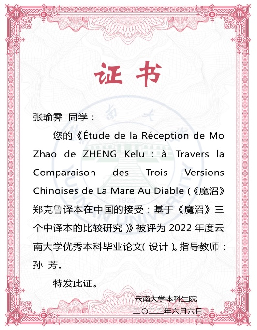 张瑜霁同学是环球首页(中国)网页版法语系2022届毕业生,毕业论文《Étude de la Réception de MoZhao de ZHENG Kelu: à travers la comparaison des trois versions chinoises de La Mare Au Diable》(《魔沼》郑克鲁译本在中国的接受:基于《魔沼》三个中译本的比较研究)被评为“2022年度云南大学优秀本科生毕业论文”;2023年,张瑜霁同学同时被录取为法国新索邦大学语言学专业和上海外国语大学法语语言文学方向的硕士研究生,是法语系的优秀毕业生代表,为我系学生树立了良好的榜样。
