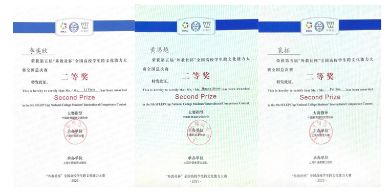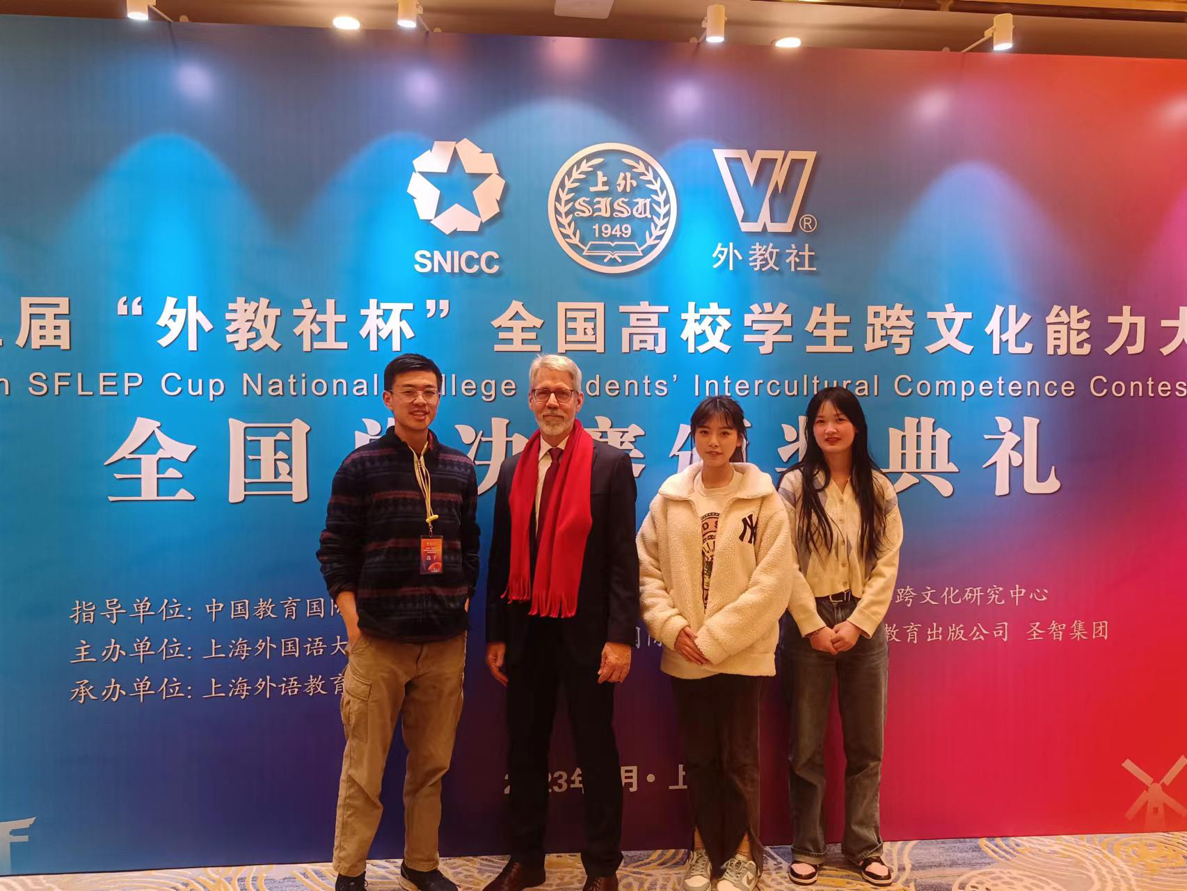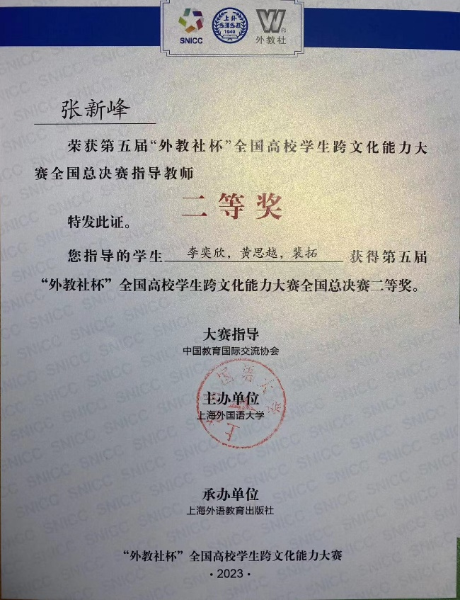 2月24日至26日,由上海外国语大学主办的第五届“外教社杯”全国高校学生跨文化能力大赛全国总决赛在上海举行。40支中国学生队伍和4支国际学生队伍历经校赛和省赛选拔脱颖而出,在全国决赛的舞台上同台竞技、大放异彩。环球首页(中国)网页版本科生黄思越(2019级英语专业)、李奕欣(2020级英语专业)、裴拓(2021级法语专业)三位同学在张新峰老师的指导下取得了全国决赛二等奖的好成绩。
