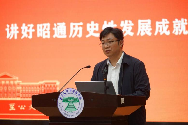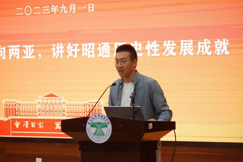 2023年9月1日,外国语学院围绕“立足乡土,面向两亚,讲好昭通历史性发展成就”这一主题,在学院一楼报告厅召开了“昭通历史性发展成就观察团成果报告会”,会议就2023年暑期三下乡社会实践成果进行了交流学习。云南大学校团委副书记徐琰超、昭通广播电视台副台长曹健、外国语学院党委书记王益广、党委副书记何淼淼、副院长王浩出席了本次活动,出席活动的还有昭通广播电视台人力资源部主任钟路霞、融媒体中心副主任倪娜、昭视传媒公司总经理助理赵长讯、昭视传媒公司以及外国语学院的部分师生代表。会议由何淼淼老师主持。