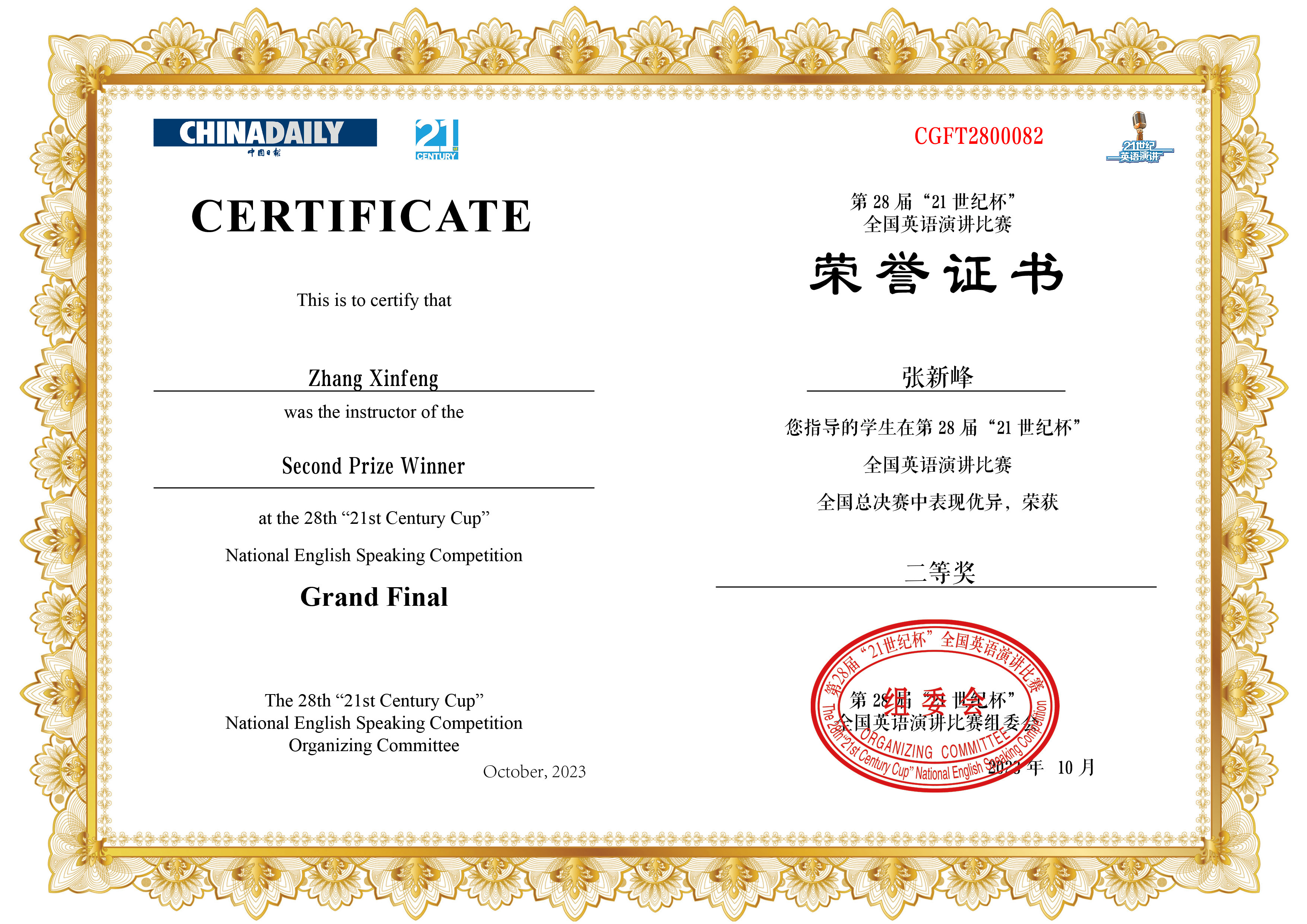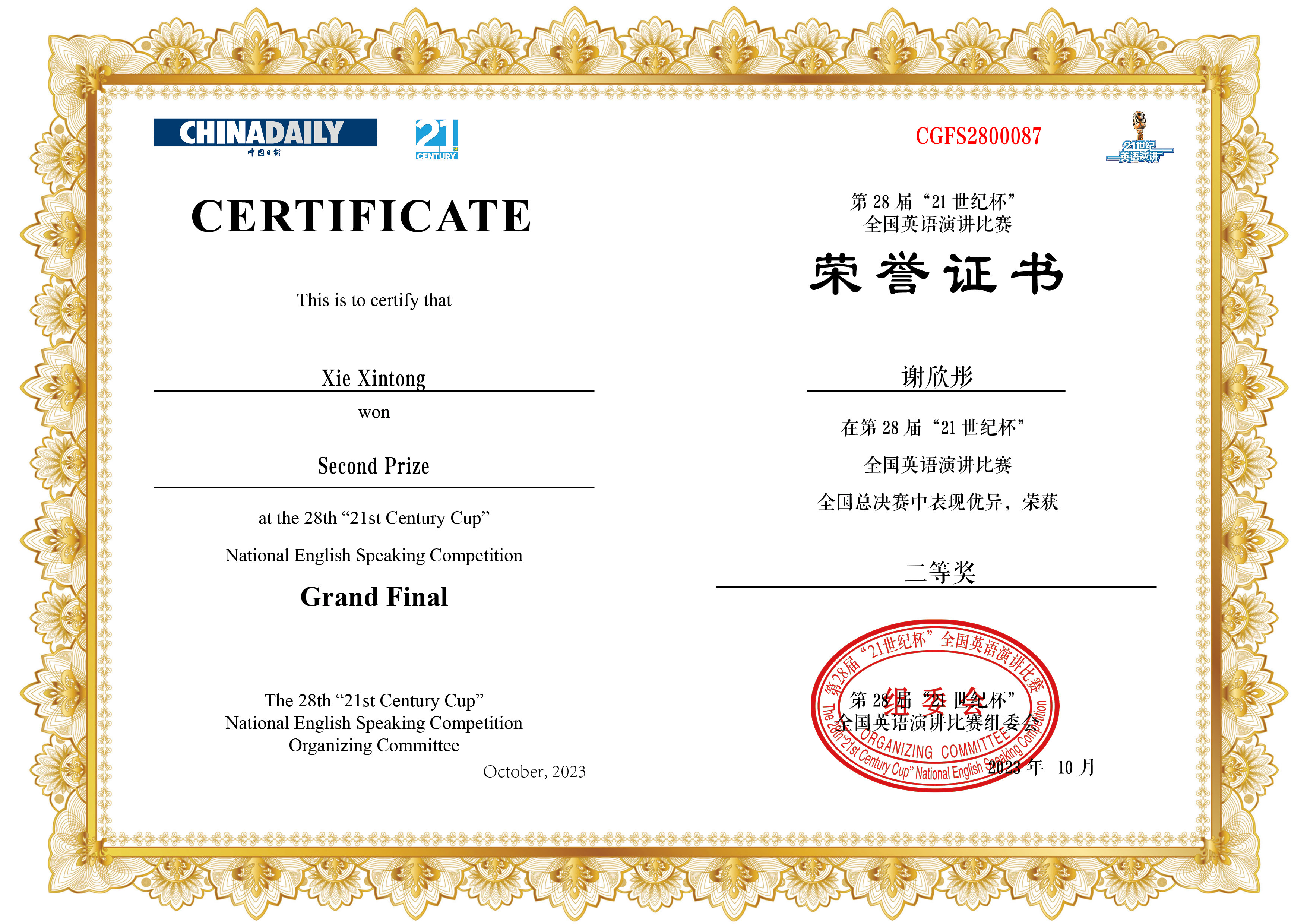 10月10日至13日,第28届中国日报社“21世纪杯”全国英语演讲比赛全国总决赛在江苏太仓举行,环球首页(中国)网页版英语专业2021级本科生谢欣彤同学在张新峰老师的指导下表现突出,荣获全国二等奖。