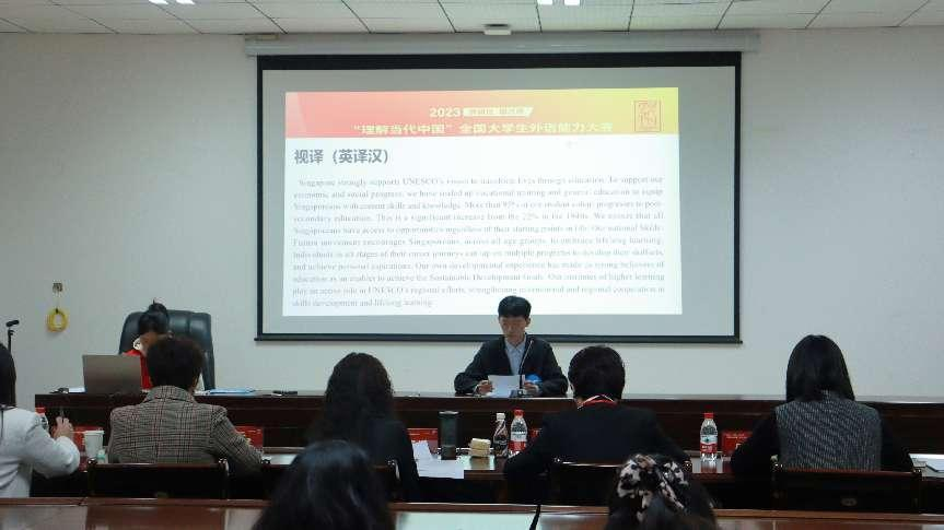 “英语演讲”省赛以“The Chinese Path to Modernization”为主题,选手们围绕“中国式现代化道路”五方面的重要特征展开论述、各抒己见,展现了卓越的语言能力、深厚的人文底蕴和宽广的国际视野。“英语口译”省赛分为视译和会议口译两个环节,凭借过硬的专业基本功,选手们用英语展现了博物洽闻的知识素养。