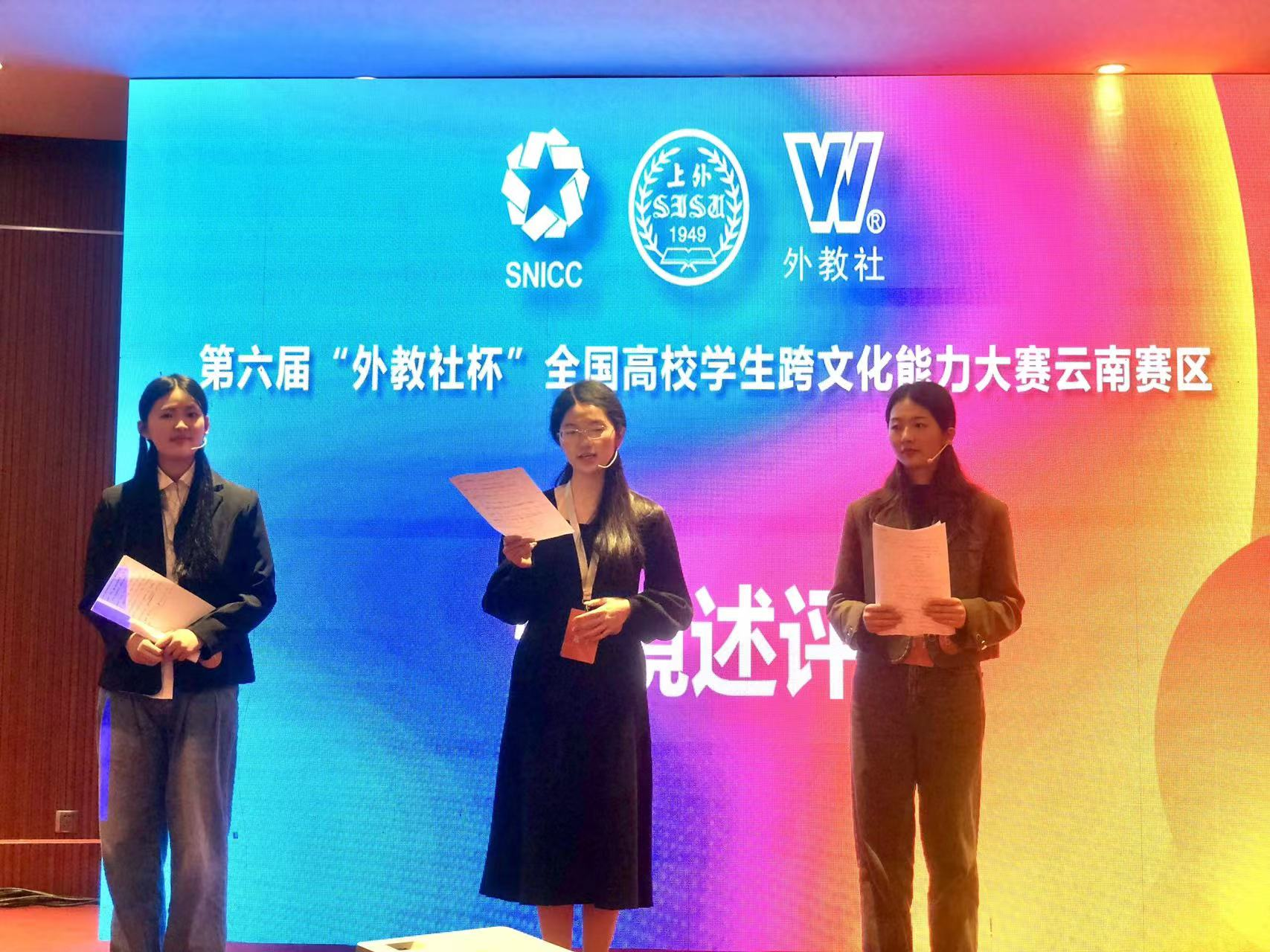 2023年11月18日,在第六届“外教社杯”全国高校学生跨文化能力大赛云南省省赛比赛中,环球首页(中国)网页版本科生英语组团队岳含溢(2021级英语专业)、马文菁(2021级法语专业)、裴拓(2021级法语专业),在张新峰老师和杨晓燕老师的指导下,获得云南省省赛特等奖(第一名)的好成绩,将代表云南省进军国赛。