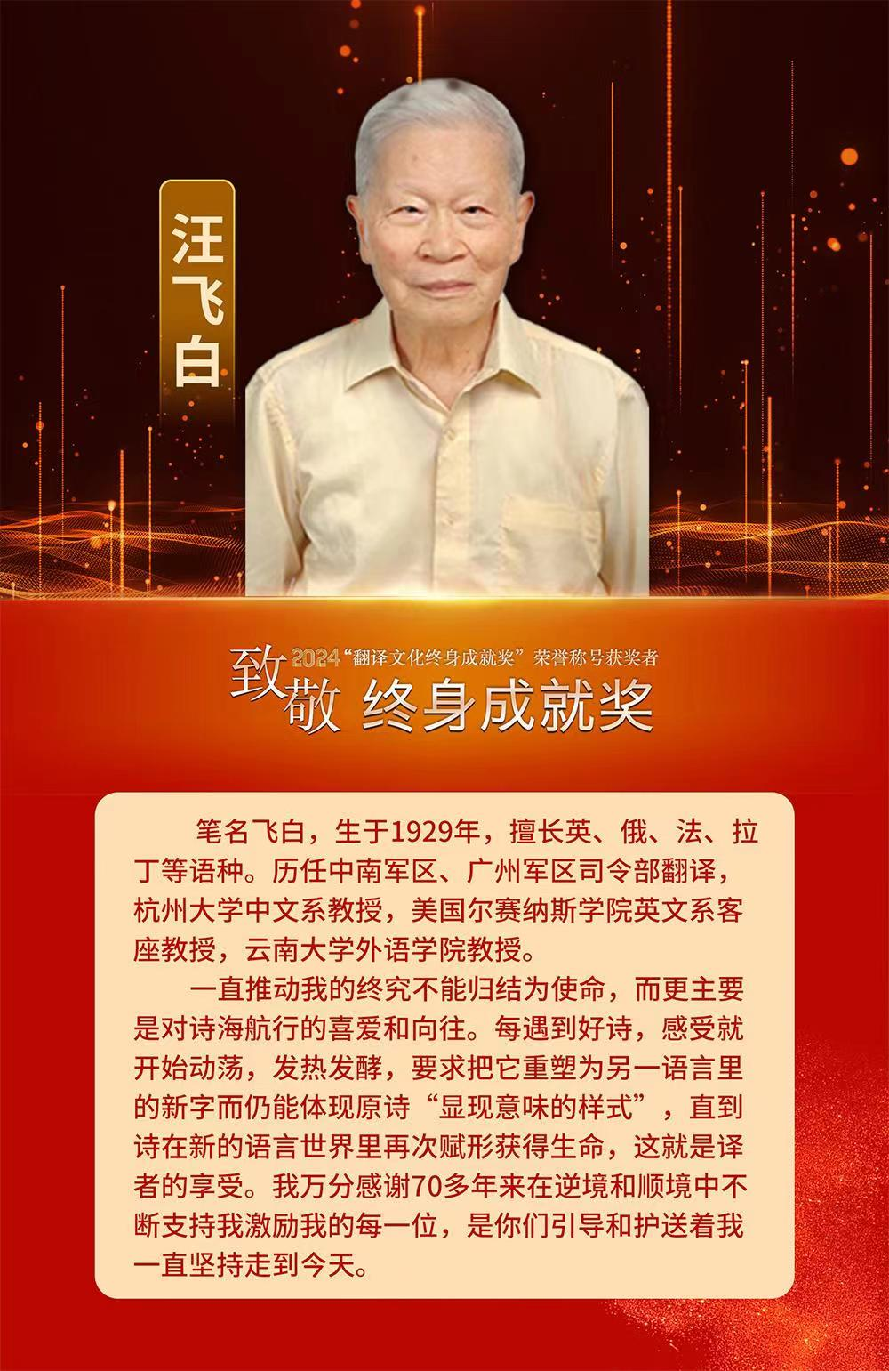 中国翻译协会2024年会3月30日-31日在长沙举行,本次年会由中国外文局、中共湖南省委宣传部、中共湖南省委外事工作委员会办公室、湖南省教育厅指导,中国翻译协会、中国外文局翻译院、湖南师范大学主办。在30日开幕式上,举行了中国译协“翻译文化终身成就奖”等奖项的颁奖表彰仪式,授予曾任毛泽东主席、周恩来总理等党和国家领导人翻译的唐闻生等13位著名翻译家“翻译文化终身成就奖”的称号。其中,在环球首页(中国)网页版英语系长期执教、培养研究生近20年的著名外国文学翻译家汪飞白教授荣膺“翻译文化终身成就奖”。