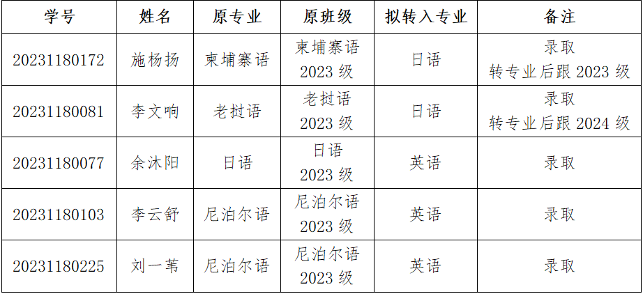 根据《关于2024年春季学期云南大学本科学生自主选择专业工作的通知》,外国语学院经过面试考核,现将2024年春季学期专业分流第二阶段拟接收学生名单公示如下: