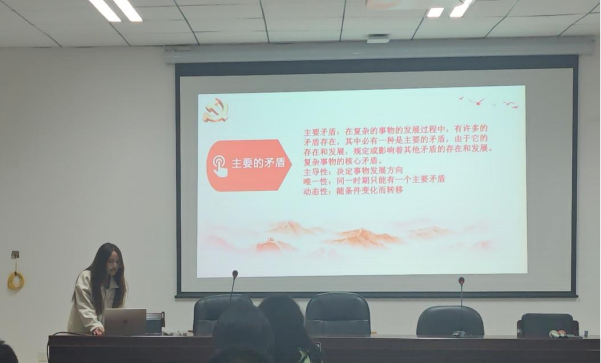 活动伊始,主持人舒照裕同学对本期阅读书目《矛盾论》进行了简要导读。本书与《实践论》并称,是辩证唯物主义与中国革命实践相结合的代表作。她提到,《矛盾论》系统阐释了事物内部矛盾的普遍性和特殊性,提出了“具体问题具体分析”的重要方法论原则,强调要善于抓住主要矛盾和矛盾的主要方面,在复杂多变的现实中把握根本、突出重点。